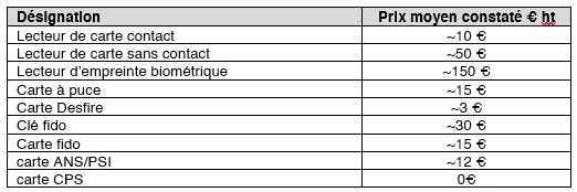 Les coûts de maintien en condition opérationnelle et de mise en œuvre sont considérés comme équivalents d’une solution à l’autre et n’ont donc pas été discriminants. Pour les supports physiques (cartes, clés) autres que les CPS fournies par l’ANS, un taux de renouvellement annuel de 25 % a été appliqué pour tenir compte des pertes et des arrivées.